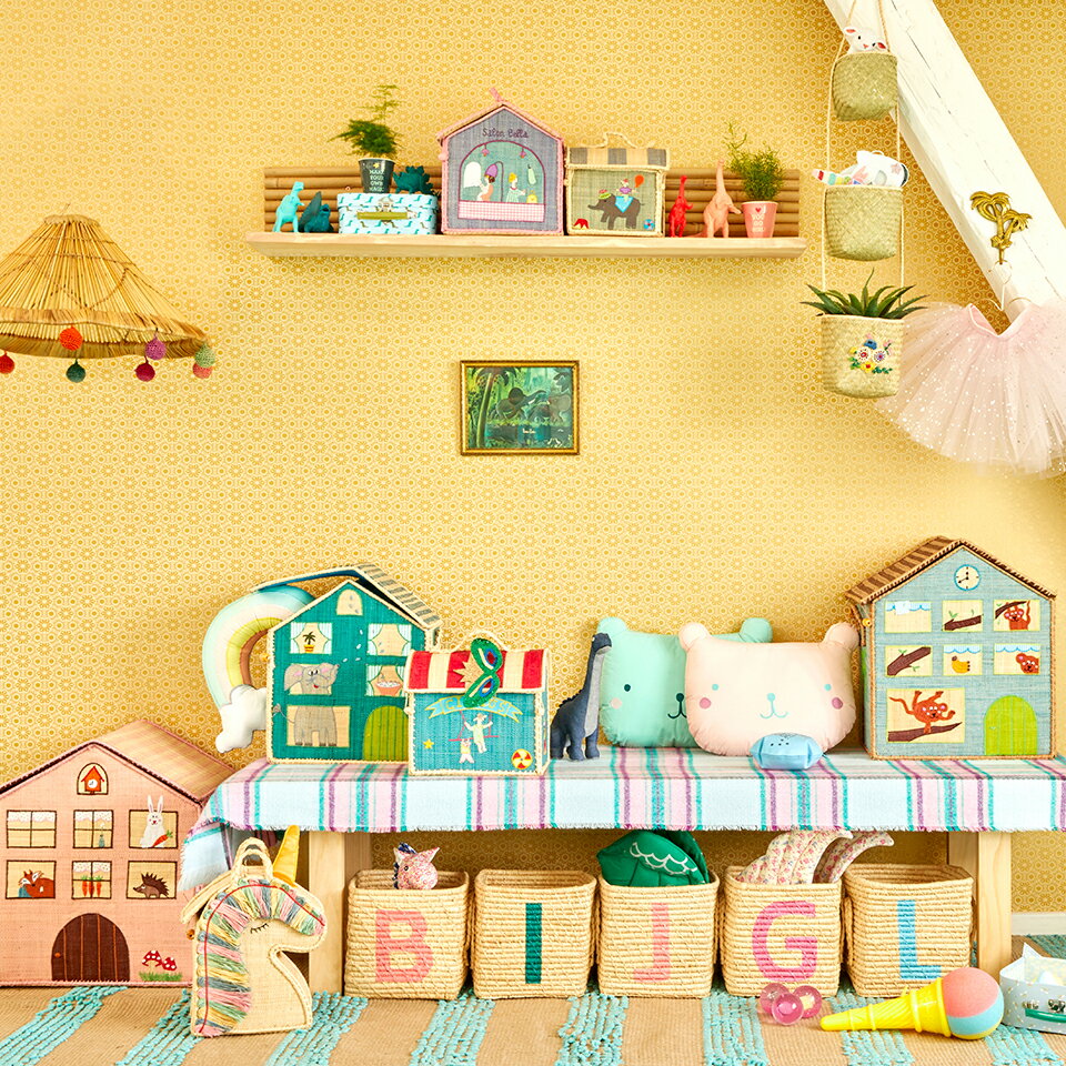 北欧デンマーク生まれのブランド『rice』のおもちゃ箱かわいい!と思わず声に出したくなるような、チェック柄の三角屋根のおうち形をしたおもちゃ箱です。